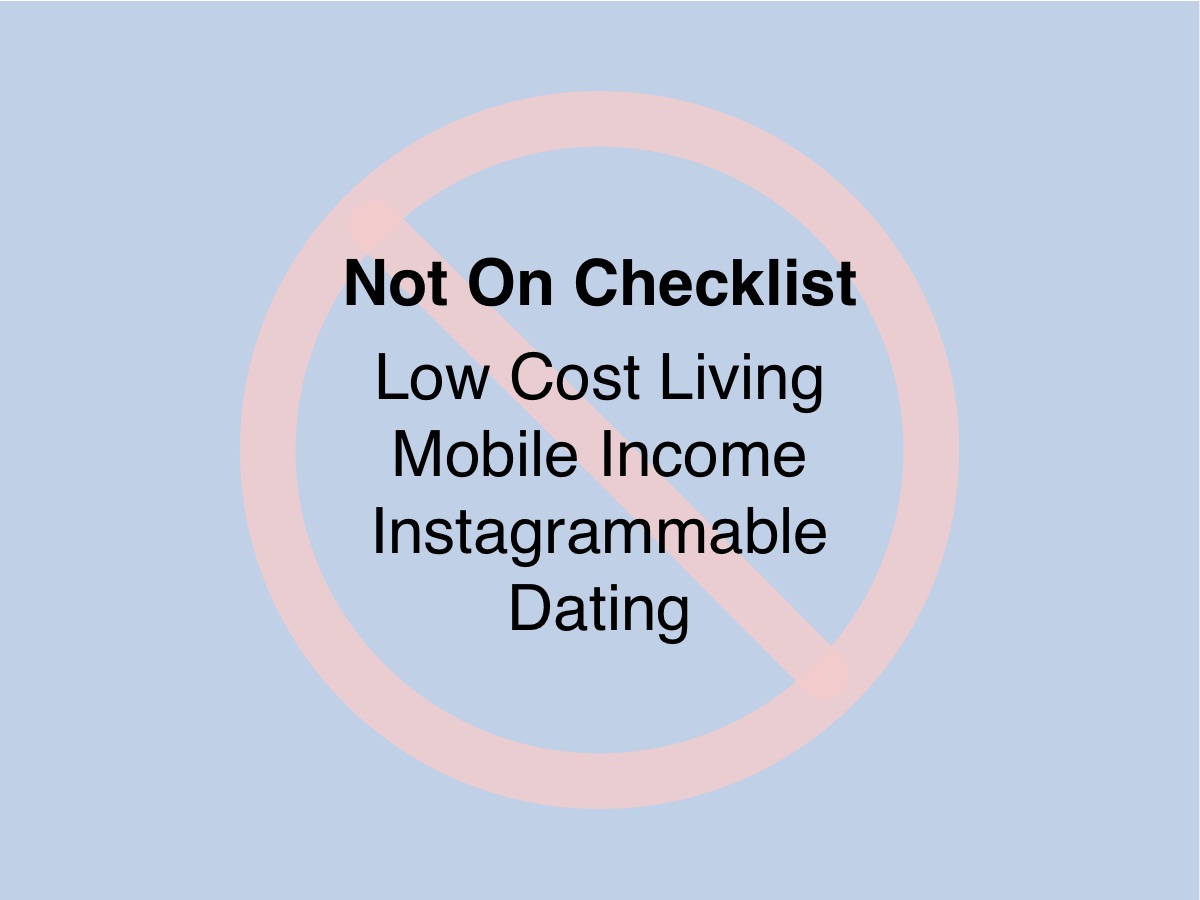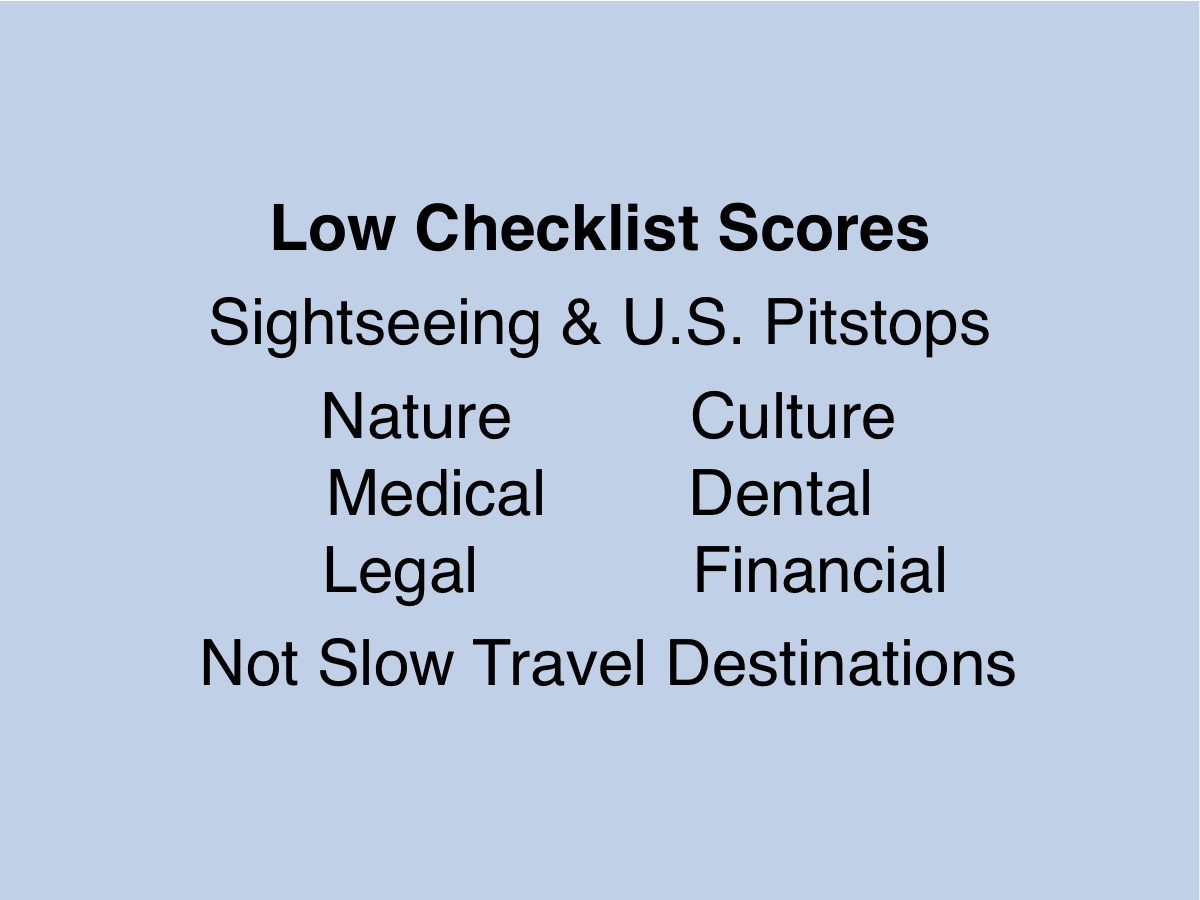 I sometimes go to places with low Checklist scores but not for slow travel. These trips are either short sightseeing excursions to natural and cultural wonders or pitstops in the United States for medical, dental, legal and financial reasons. High Checklist scores are absolute requirements for all of my slow travel destinations.