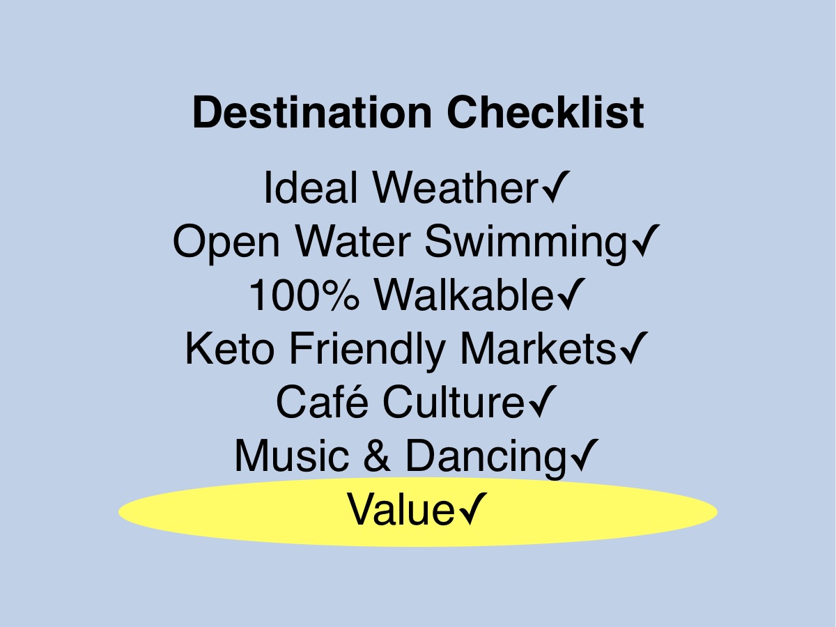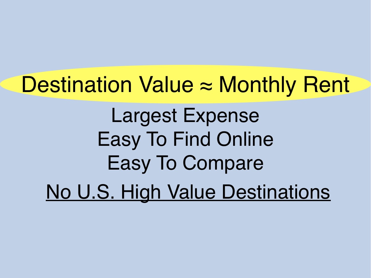 Rental rates overshadow all other slow travel costs like airfare and food. High-season monthly rental rates are the only data necessary to determine Destination Value. I am unaware of any destination in United States with high enough Value for me to slow travel to. There are many places outside of the United States that score high in all Checklist categories including Value.