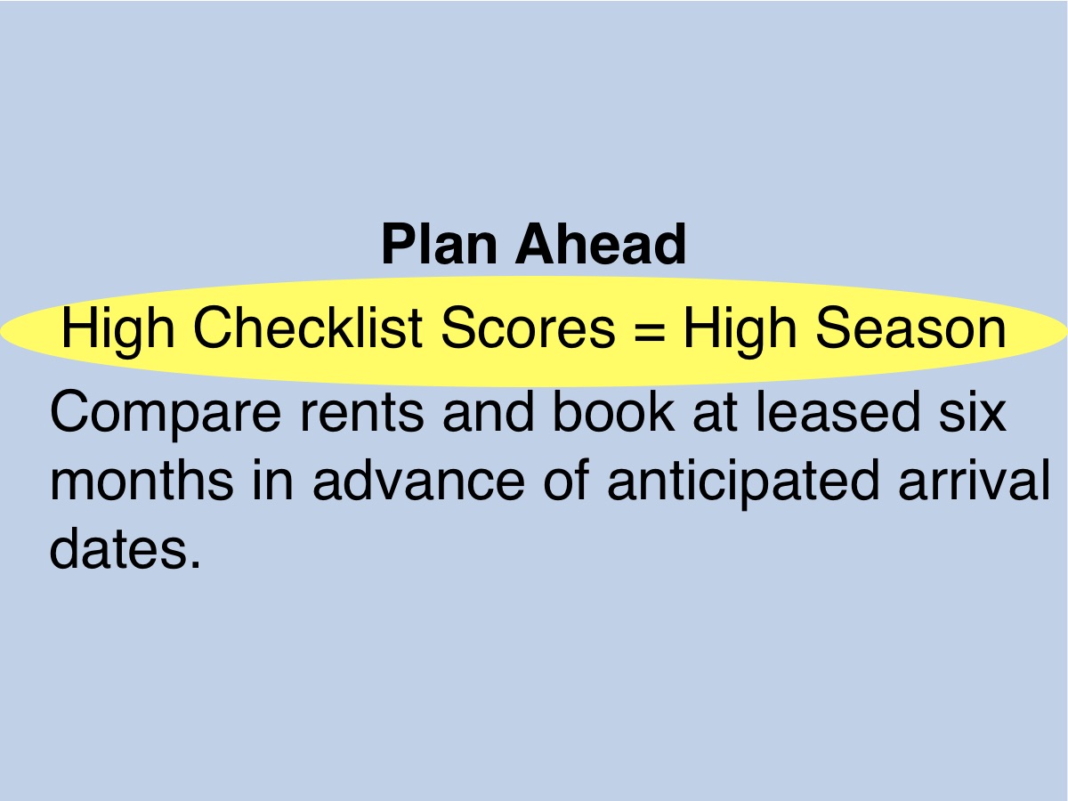 Locations with high Destination Checklist scores are very desirable during Ideal Weather windows that span high tourist seasons and shoulder months immediately before and after. Comparing rents and making reservations must be done well in advance of high-season to insure there are lots of vacancies to choose from. I compare rents and book accommodations at least six months in advance of anticipated arrival dates. Booking late or after arrival does not work well for me.