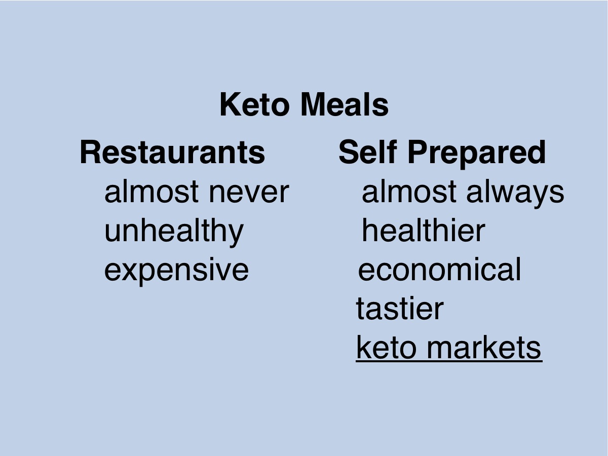 I prepare nearly every meal and rarely eat out because I am a far better cook than most restaurants whose food is universally unhealthy and expensive.  My cooking ingredients are sourced from Keto Friendly Markets that I define as having abundant varieties of high quality animal products, olive oil and non-starchy vegetables.  I always book slow travel accommodations with adequate cooking facilities that are within easy walking distance of Keto Friendly Markets.