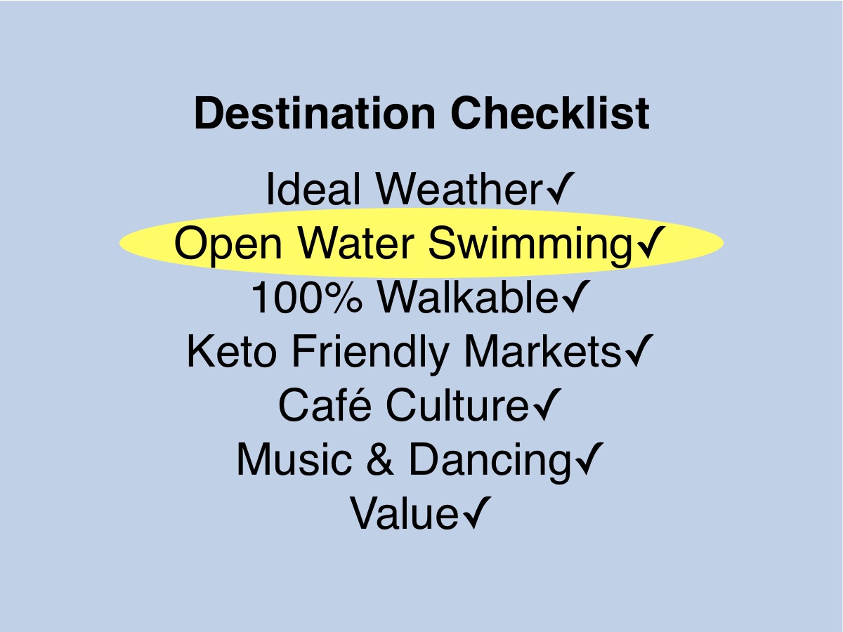 After looking up weather and walkability, choosing slow travel destinations with good Open Water Swimming is mostly a process of eliminating places with bad natural features and/or human activities. It takes research, a bit of guesswork and boots-on-the-ground exploring.