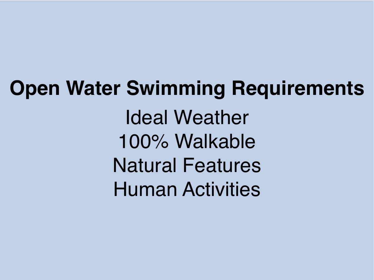 Determining Natural Features and Human Activities bad for Open Water Swimming is more difficult than looking up Ideal Weather conditions and determining 100% Walkability.