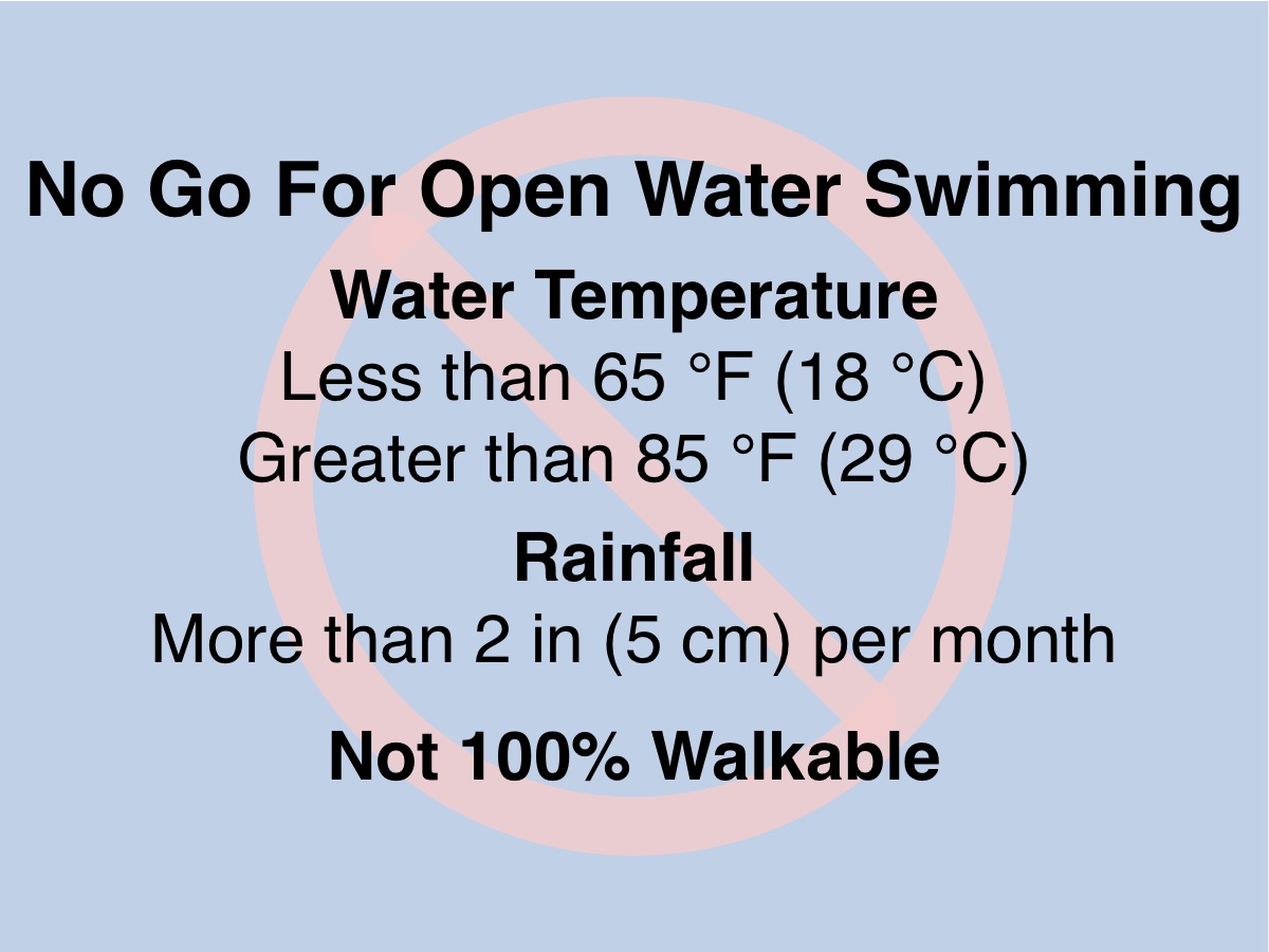 Water Temperature limits are my comfort zone for swimming. Water Temperature, Rainfall and 100% Walkable are easily to research (see Ideal Weather and 100% Walkable posts).