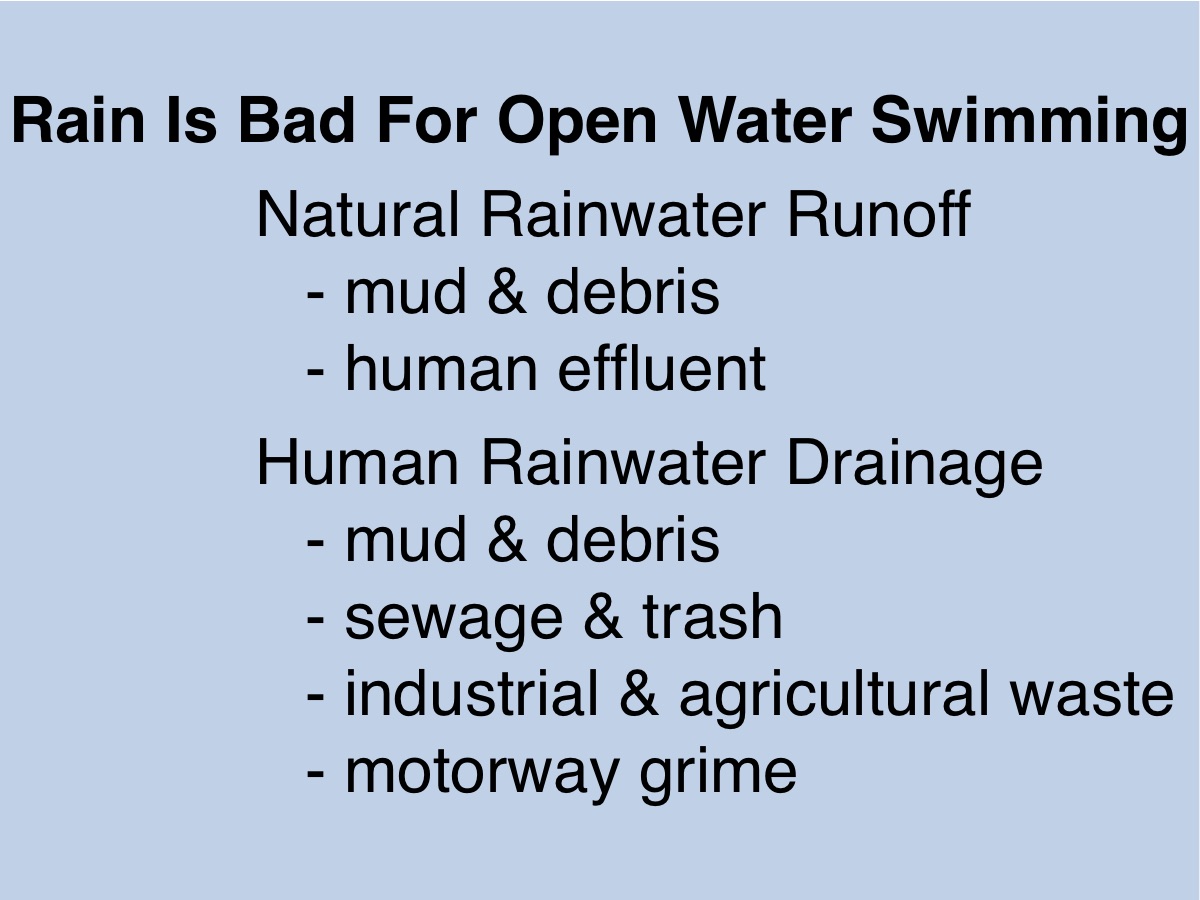 Low rainfall is an absolute requirement for slow travel not because swimming in the rain is necessarily unpleasant or dangerous per se. It is because rainwater runoff from the land flushes natural mud and debris along with raw sewage, trash, motorway grime, industrial and agricultural waste directly into swimming areas. This is especially true in developing countries that have inadequate infrastructures for sewage treatment, trash removal, storm sewers and drainage to handle runoff from the land. Rainwater runoff is a routine and ignored fact of life in developing countries.