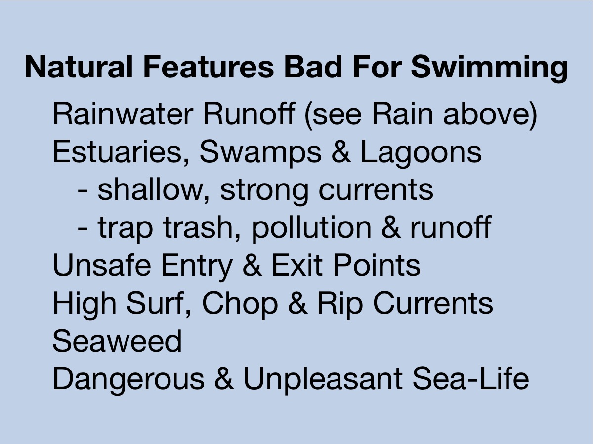 Natural rainwater runoff is an obvious and easily problem to avoid. Reasons may not be as obvious for avoiding other natural features. An example is Mauritius’ well known Flic ’en Flac beach. The beach looks great but the designated swimming area is a narrow shallow channel along the shore of the lagoon behind a barrier reef. Signs forbidding swimming outside the designated zone are enforced by coast guard patrol boats. There are strong currents over sharp coral and sea urchin spines outside of the zone. Flic ‘en Flac is not good for Open Water Swimming and is therefore not a place I would slow travel to.
