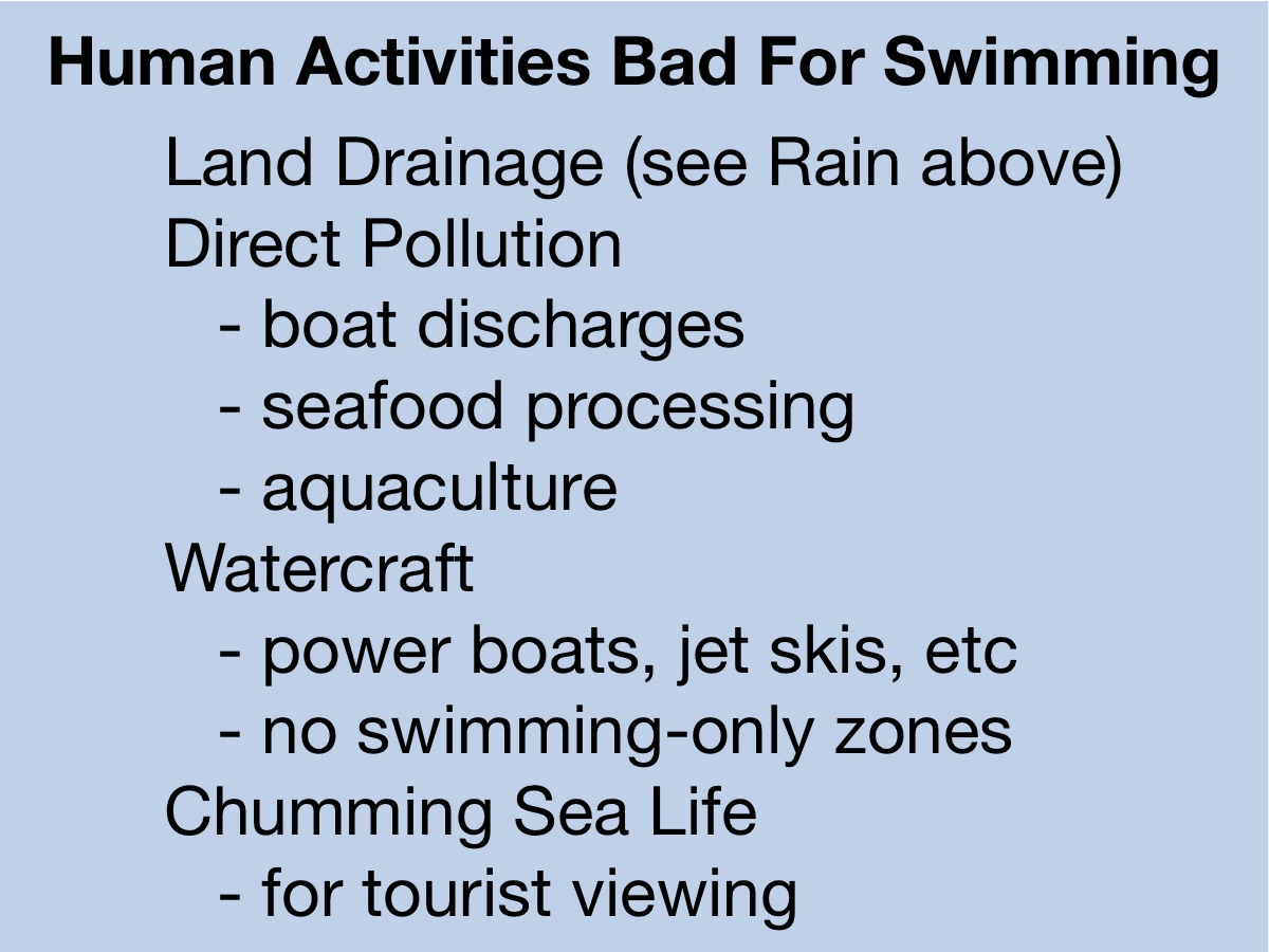 Land drainage is an obvious and easy problem to avoid. Reasons may not be as obvious for avoiding other human activities. For example, local tour guides often chum patches of water with food that attracts sea-life for tourists to view. It seems relatively harmless at first glance but it can exacerbate a natural problem. Chummed sea-life associate humans with food and approach swimmers looking for a free lunch. Observing sea-life while swimming can be a positive experience when the animals are going about their natural business. It becomes unpleasant and dangerous when they see humans as a source of food and aggressively pursue, interfere with and bite swimmers.