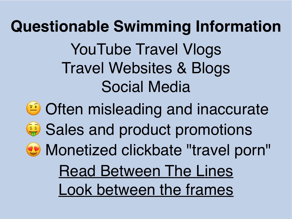 Always read between the lines and look between the frames of travel information. Open water swimmability is NOT necessarily indicated by video clips of beautiful beaches. For example, Bali’s famous and photogenic Sanur Beach borders an unswimmably-shallow lagoon behind a barrier reef that fills with muddy polluted runoff every time it rains. It is unsuitable for Open Water Swimming and therefore not a destination I am likely to slow travel to again..